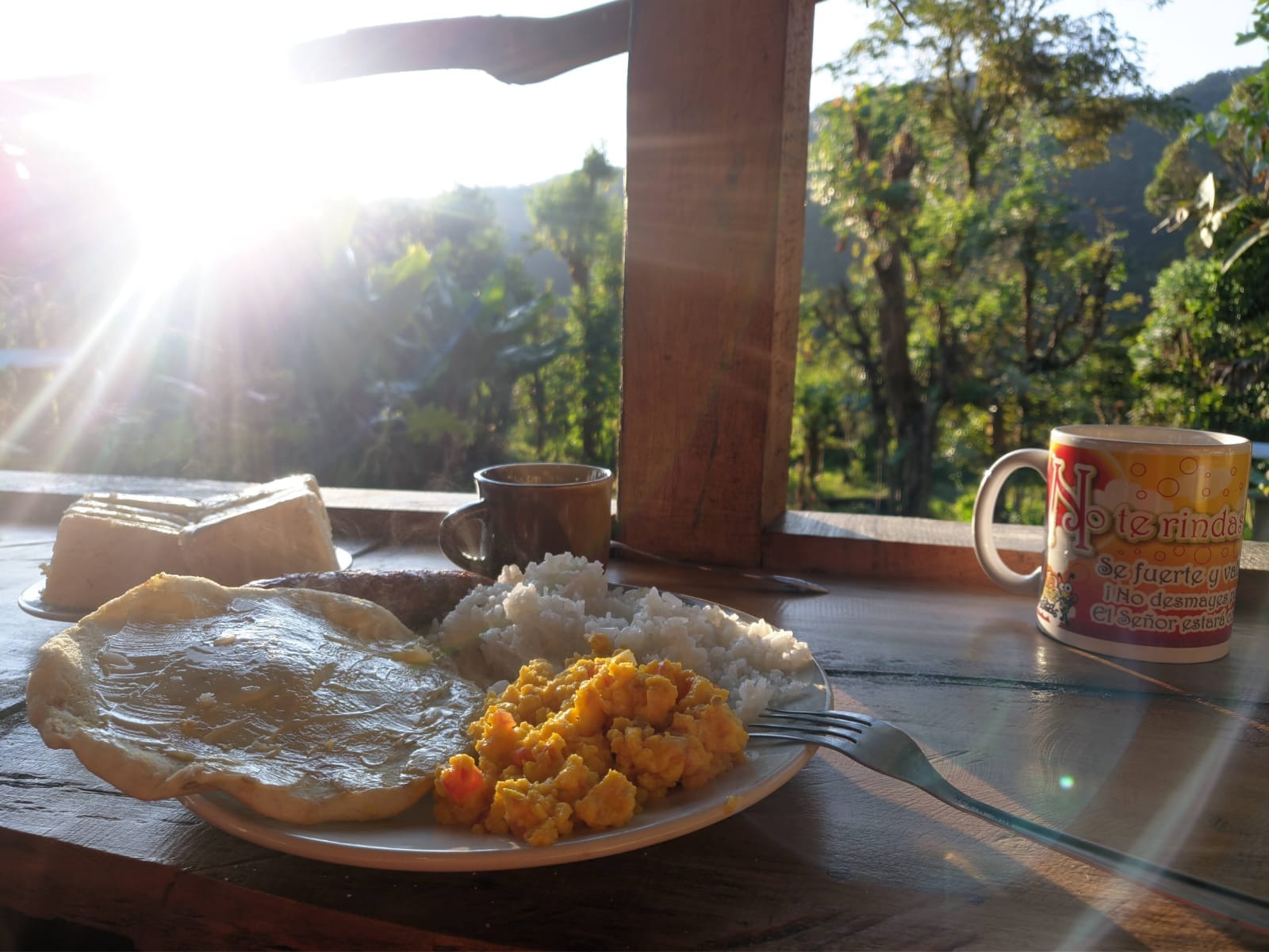 Chocolate con queso, huevos al gusto, arepa recién horneada y calentado de frijoles. Y por supuesto, un delicioso café, de esos que solo te puedes tomar de forma tradicional en las fincas. Eso sí, lleven plata porque don Carlos cobra por todo, incluyendo la entrada a la cascada y claramente, el rico desayuno.